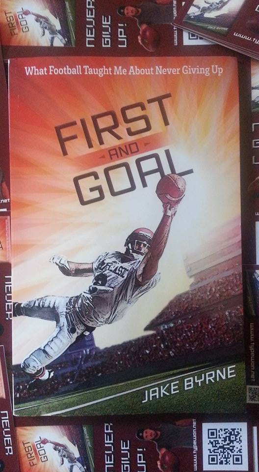 This little book called First and Goal, what football taught me about never giving up, Published by Harvest; it is written by former Wisconsin Badger/NFL Tight End Jake Byrne. Just a side note, his mother is phenomenal writer Holly Michael, author of Broken Lines, also published by Harvest. I was honored to get a free copy to write a book review.